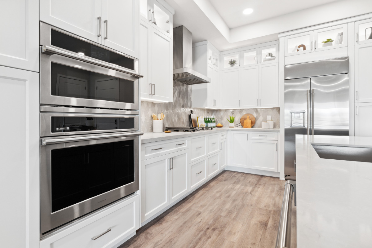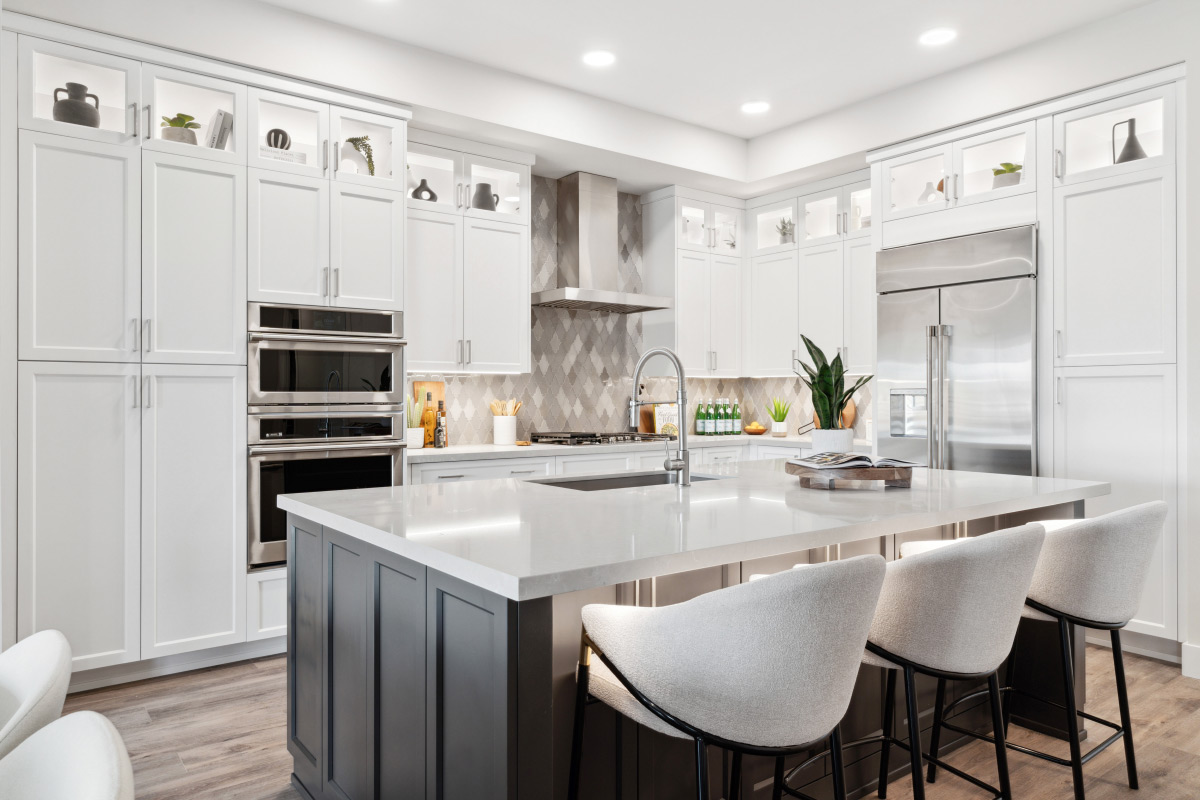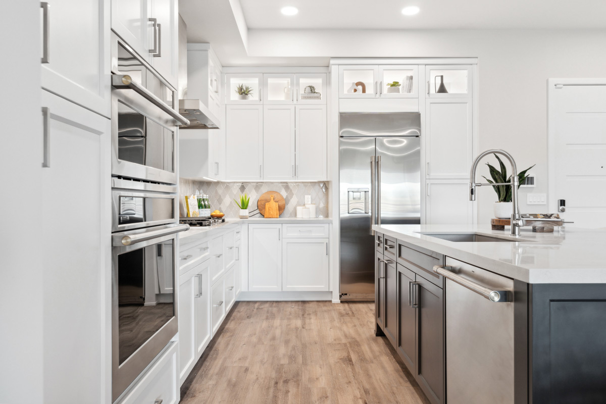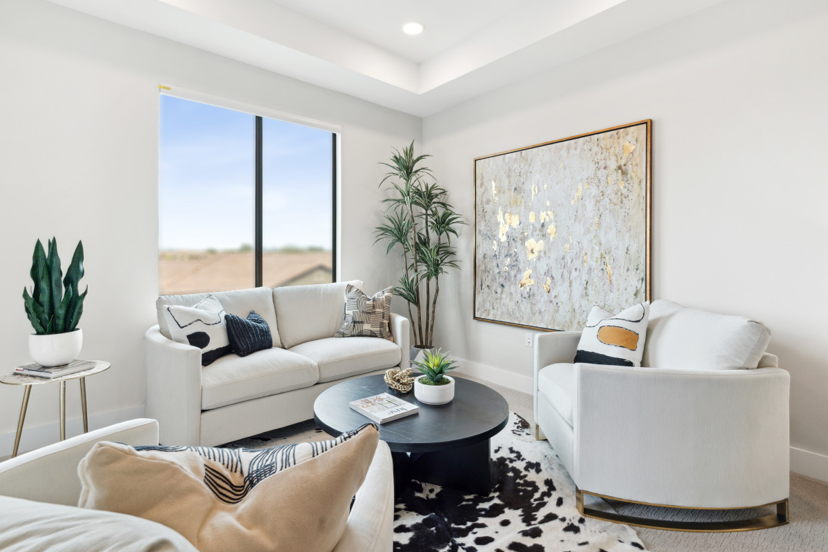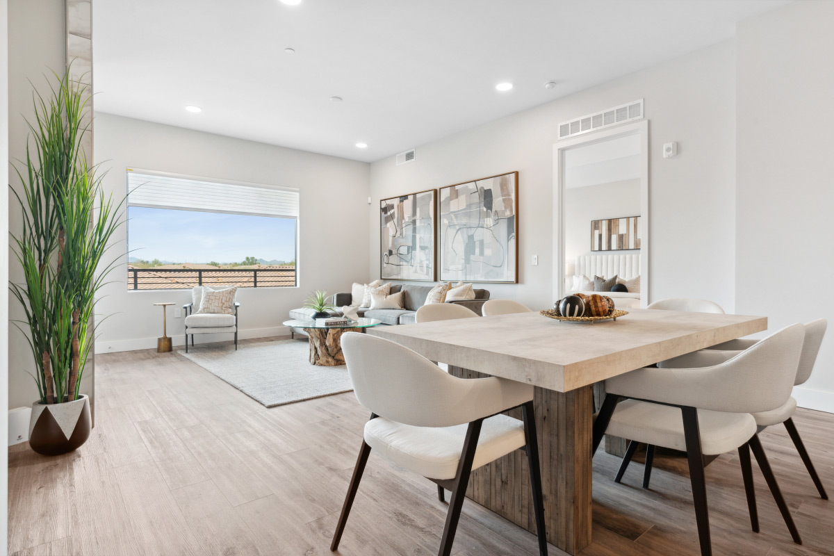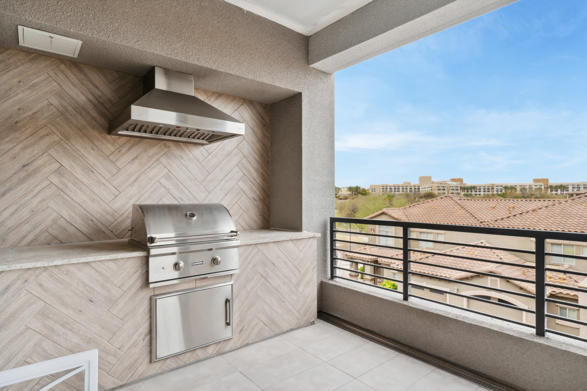 Our Armani design features 2 bedrooms, 2 bathrooms, and an expanded patio. Armani boasts 10-foot ceilings in the kitchen and living room, with a penthouse option of 11-foot ceilings and expansive transom windows. Your kitchen features premium appliances, including double built-in ovens, a wine cooler, and a natural gas 5-burner cooktop. These are paired with our upgraded quartz countertops and raised panel cabinets, elevating your cooking space. Your living area is open and free of structural pillars with a gas fireplace for those desert winter nights.