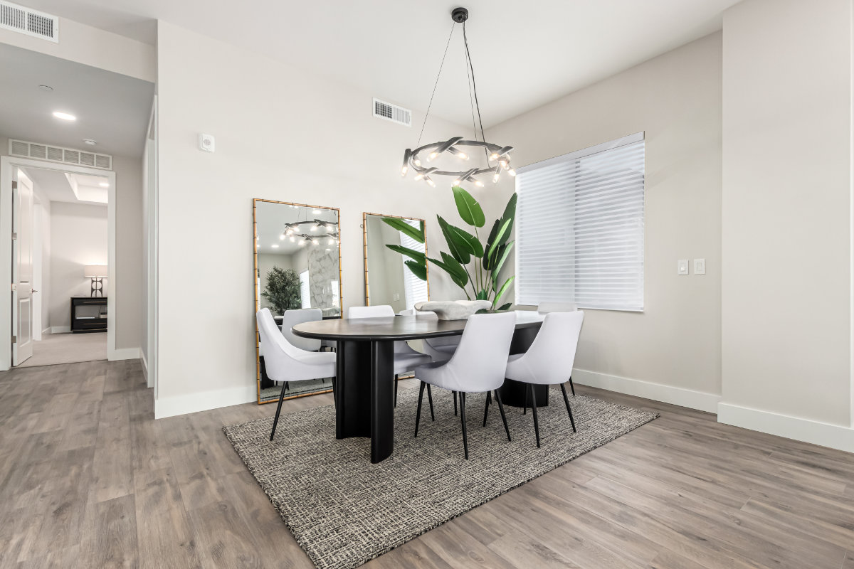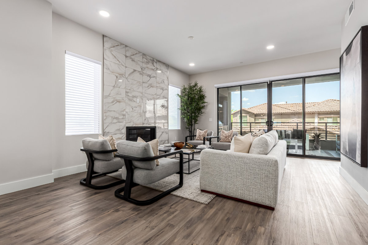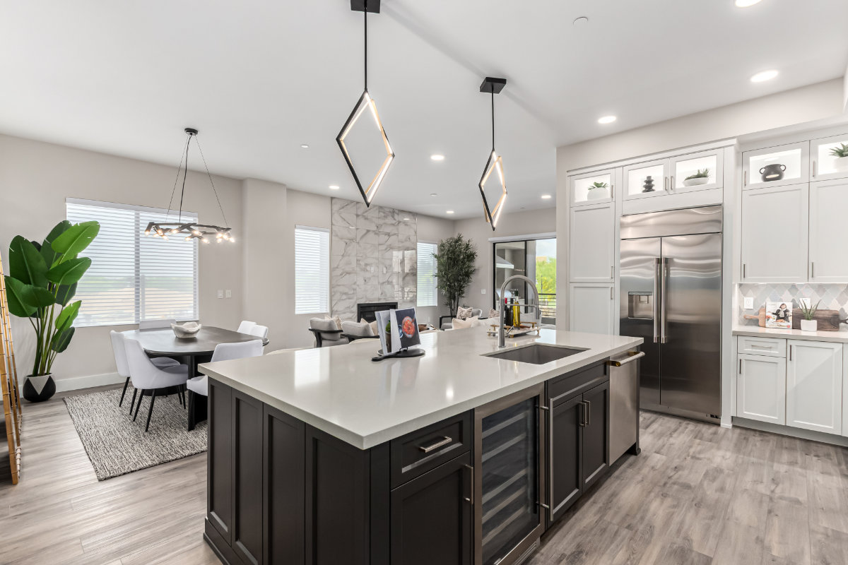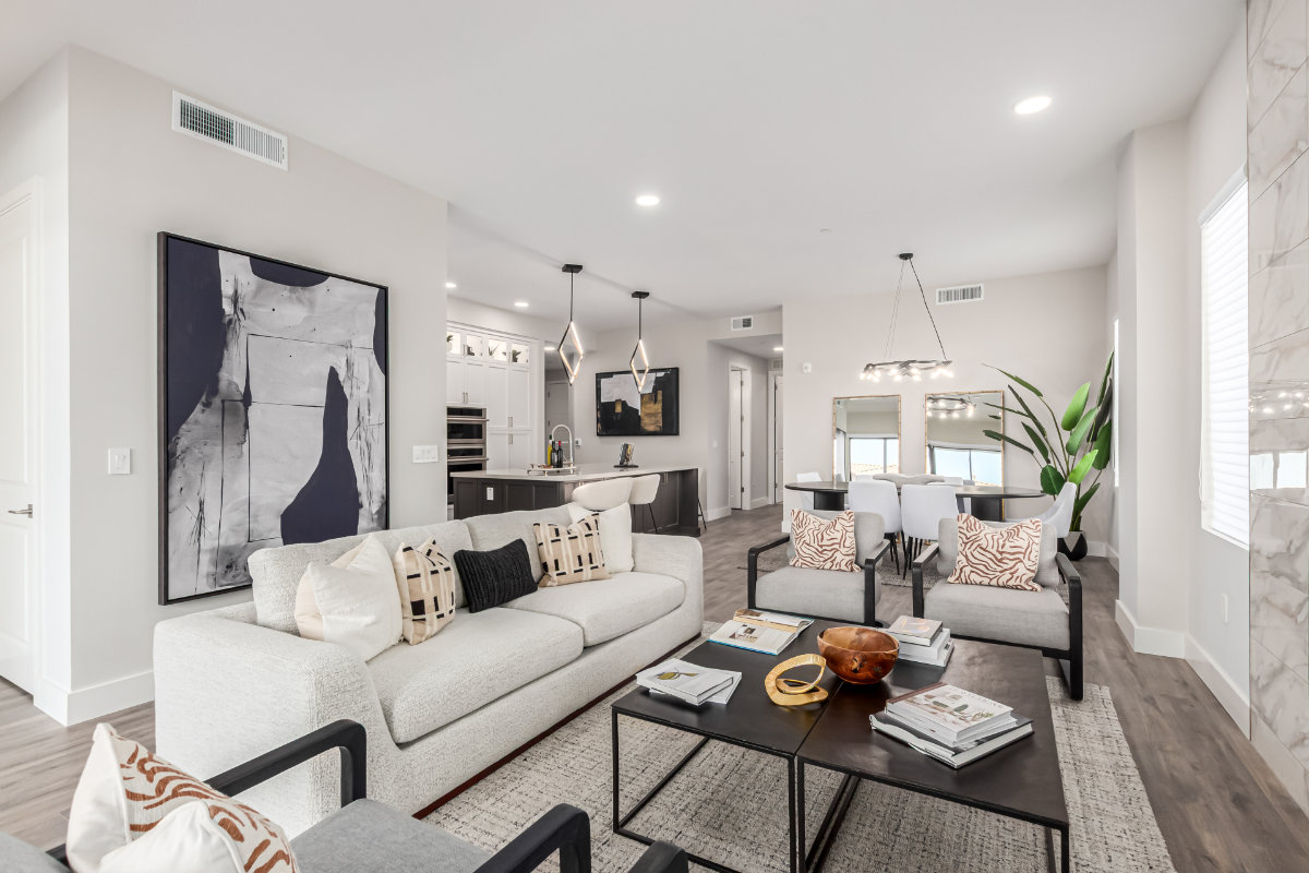 Our Capri design features 3 bedrooms, 2.5 bathrooms, and an expanded patio. Capri boasts 10-foot ceilings in the kitchen and living room, with a penthouse option of 11-foot ceilings and expansive transom windows. Your kitchen features premium appliances, including double built-in ovens, a wine cooler, and a natural gas 5-burner cooktop. These are paired with our upgraded quartz countertops and raised panel cabinets, elevating your cooking space. Your living area is open and free of structural pillars with a gas fireplace for those desert winter nights.