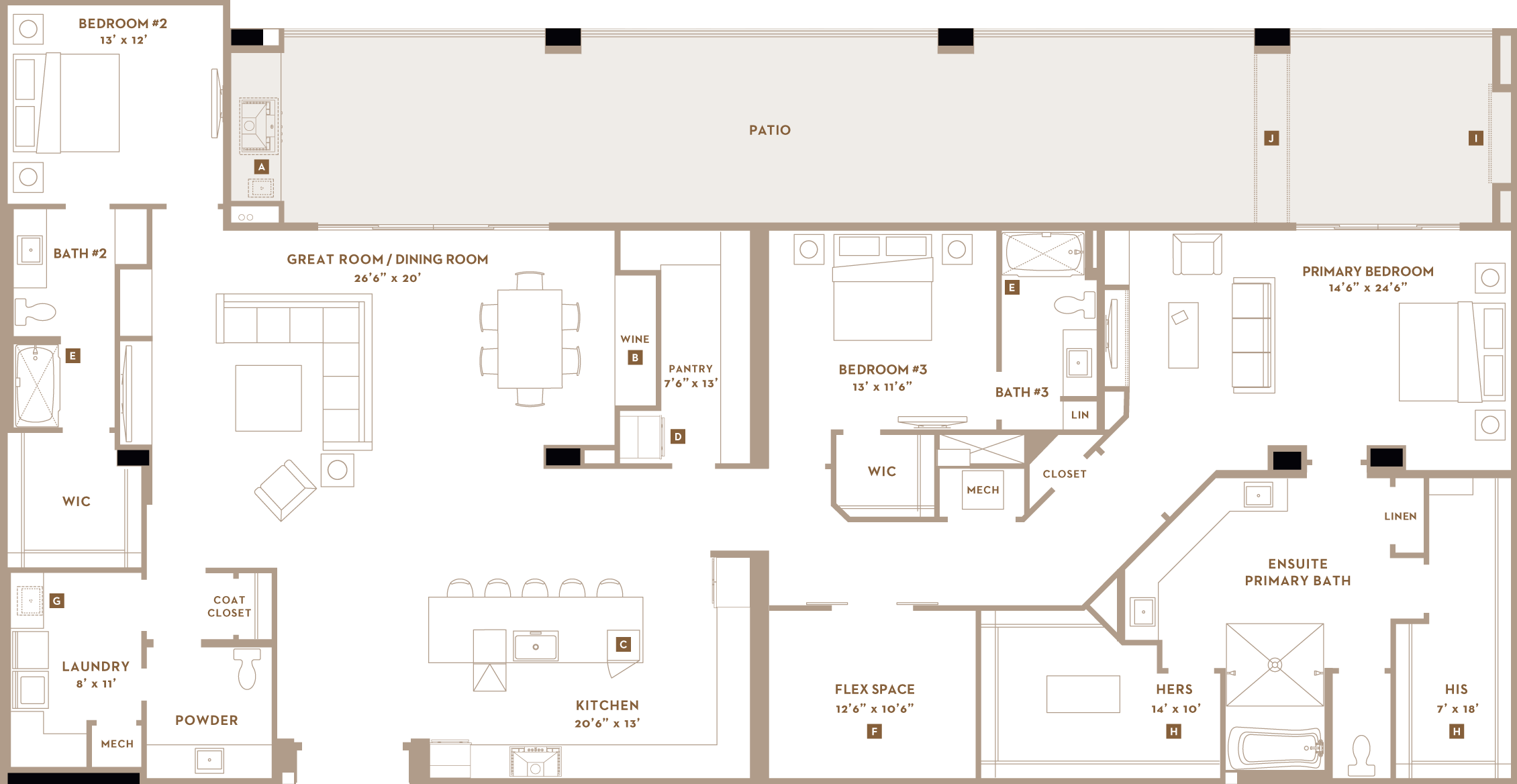 Our D’Luxe design features 3,167 square feet of living space, 3 bedrooms including dual primaries, 3 bathrooms, and an expanded 891 square-foot patio. D’Luxe features include: smart home technology, 10’ ceilings in living room and kitchen, living room gas fireplace, upgraded appliances, double built-in ovens, natural gas 5-burner cooktop, upgraded quartz countertops and frameless cabinets, double primary suites with dual walk-in custom closets, quality bathroom finishes with comfort height toilets, large laundry room, indoor/outdoor living expansive patio with an extra primary patio and two dual sliding glass doors.